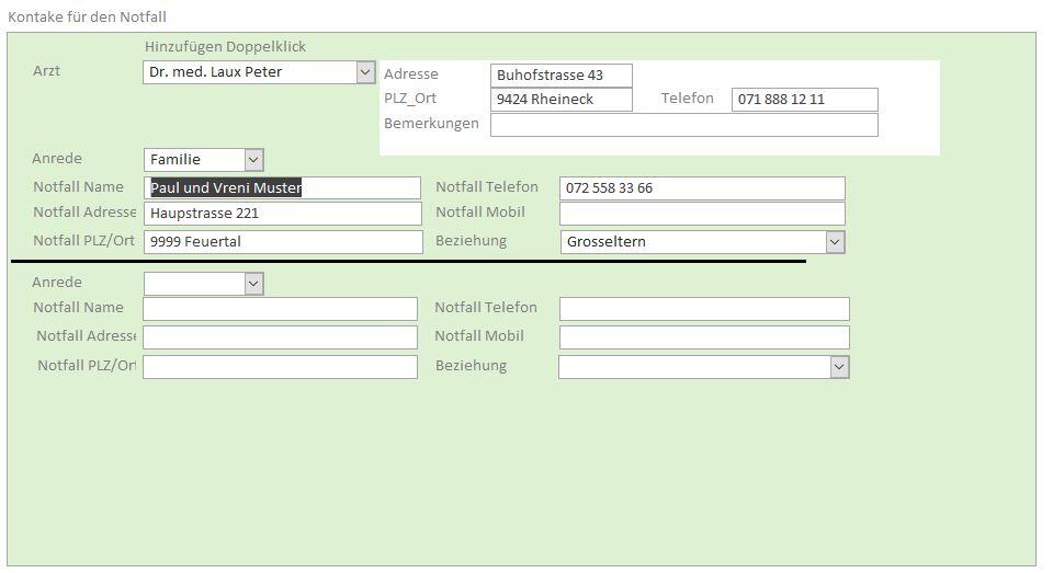 Angaben über den Hausarzt und wer im Notfall zu benachrichtigen ist. Es können zwei Personen angegeben werden. Der Hausarzt wird über das Listenfeld aus der Ärzte Adressdatei ausgewählt.
