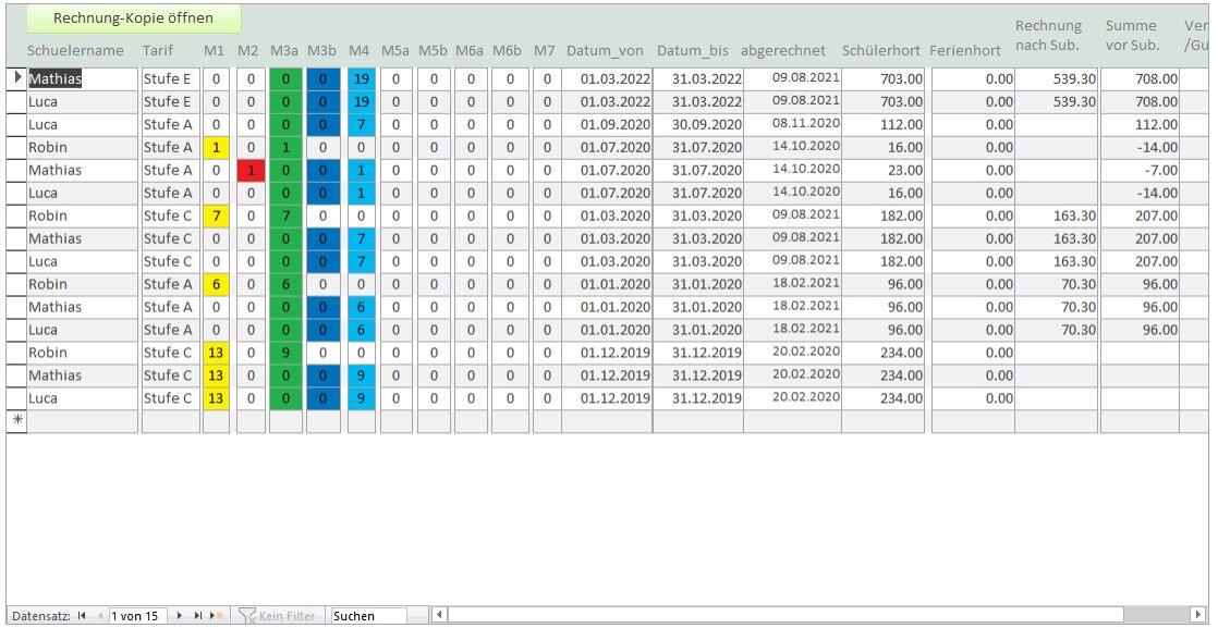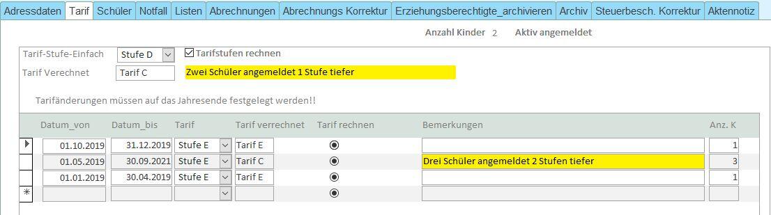 Werden mehr als ein Kind aus derselben Familie betreut, wird dies in der Tarifliste gelb hinterlegt. Die Tarifstufe wird in diesem Fall tiefer gerechnet. Die Tarifreduktion wird in den Einstellungen festgelegt.