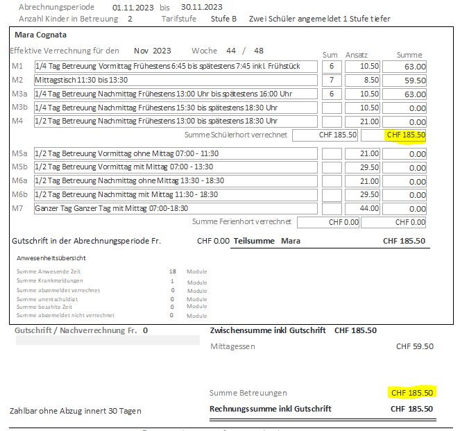 Bei der monatlichen Abrechnung wird die Subvention für den MIttagstisch berücksichtigt.